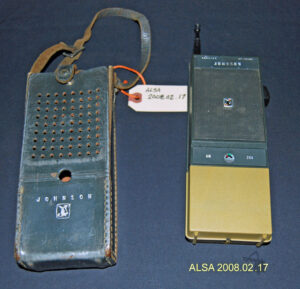 This pair of Johnson hand-held radiophones (Walkie-Talkies) house a rechargeable battery pack (Batteries have been removed). The top of the phone has a retractable chrome antenna on it that extends to 76 cm, and collapses to 6 cm. The top also has “ON/OFF”, “VOLUME” and “SQUELCH” controls. The front of the unit has a speaker grill with a Johnson logo in the centre of it, a battery level indicator and the words “JOHNSON AM 204”. The back of the unit has a female plug in for an external antenna and two labels with the model, type and serial numbers on them.