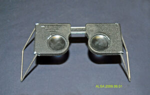 CF-8 Stereoscope and leather case. The stereoscope is made of two black cast metal frames, each holding a circular magnification glass. These frames are joined by a sliding cast scale graduated in mm: the numbers 50, 60 and 70 are in raised lettering on the scale. The dimensions of the frames when fully-extended are 15 cm (l) X 5.5 cm (w) X 1 cm (t) or 12 cm (l) when collapsed. There are two folding metal silver-coloured boxed legs on either end of each frame. These legs are 12 cm (l) X 7 cm (w) at the widest point. Cast into the top of one of the frames in raised lettering are the words “ABRAMS INSTRUMENT CORP LANSING, MICH. PATENTED”.